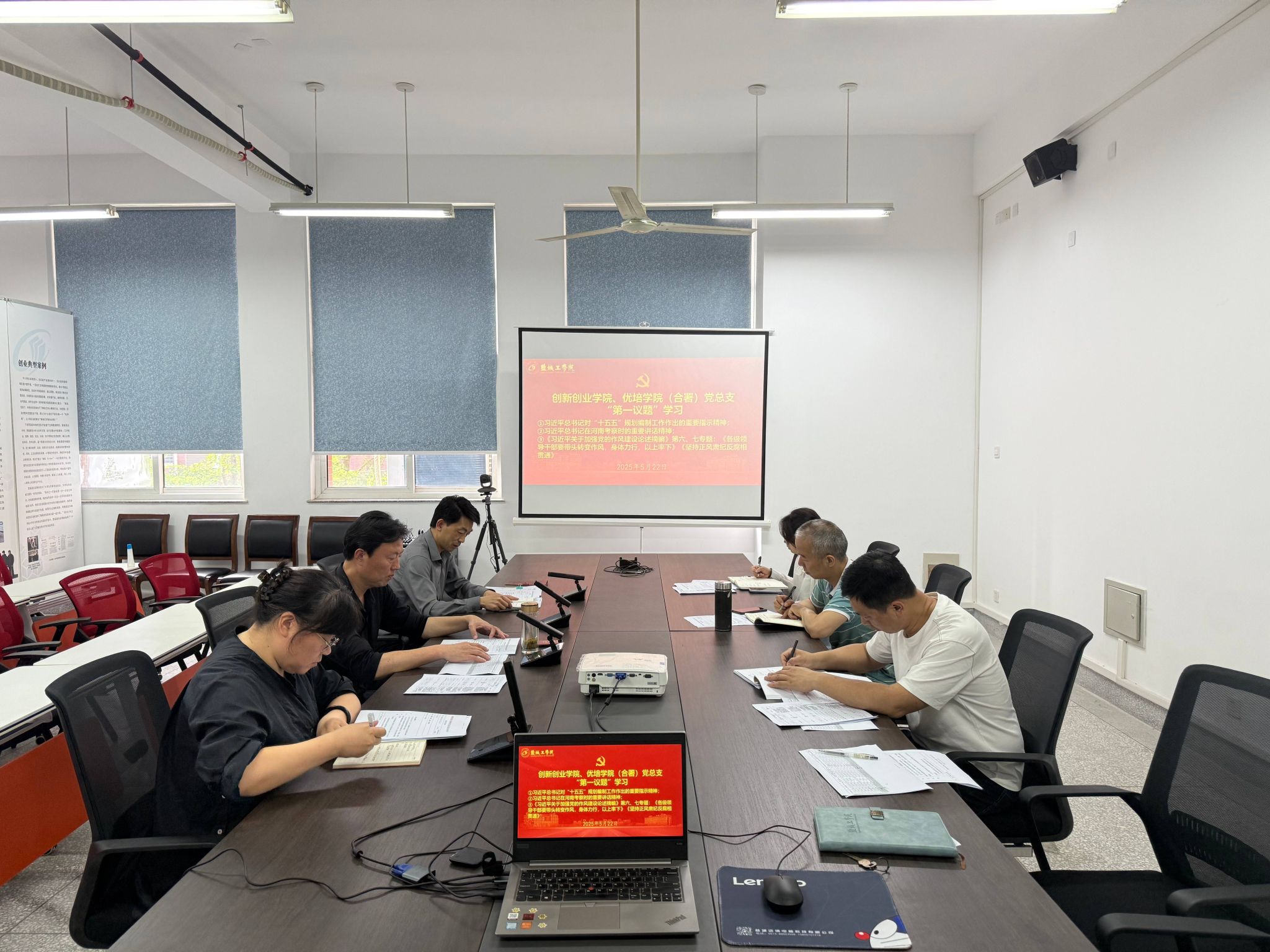 2025年5月22日下午,在希望大道校区仁和楼A202东会议室,英国365公司、英国365公司(合署)党总支以“第一议题”形式,深入传达学习习近平总书记对“十五五”规划编制工作作出的重要指示精神、习近平总书记在河南考察时的重要讲话精神和《习近平关于加强党的作风建设论述摘编》第六、七专题:《各级领导干部要带头转变作风,身体力行,以上率下》《坚持正风肃纪反腐相贯通》。学院党总支书记魏巍主持,党总支成员和相关科室负责人参加学习。