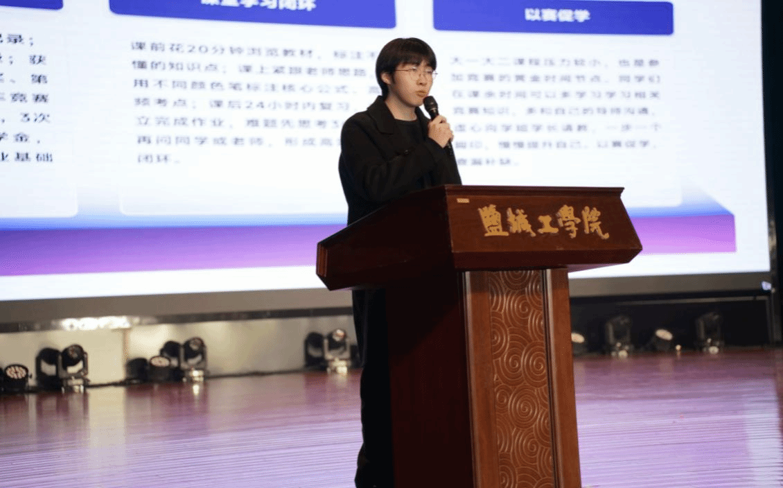 G电信231徐杰同学作为代表登台,分享自身3.6绩点的专业学习经历、从校级到省级学科竞赛的成长故事,并给出切实建议:锚定学业核心、平衡课堂与实践、遇困难多请教、保持热爱。真挚分享引发全场共鸣,掌声经久不息。