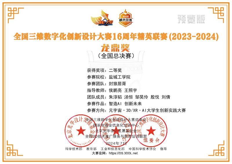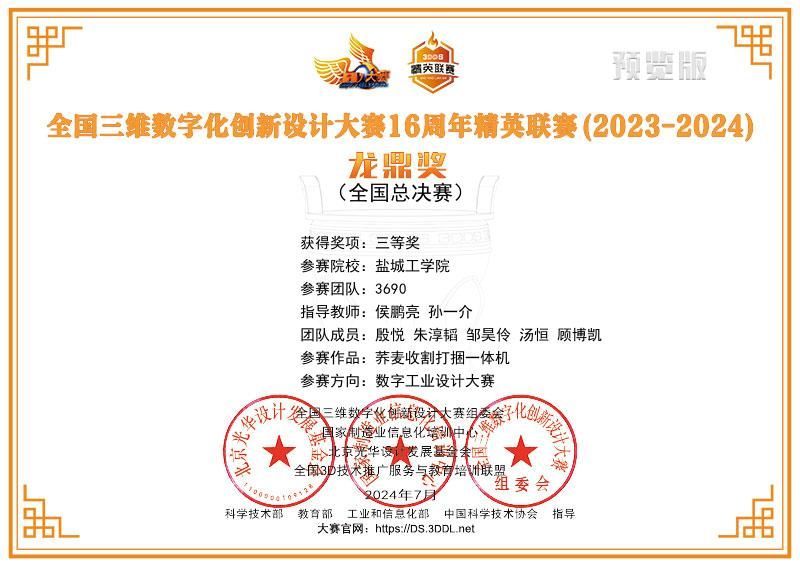 近日,全国三维数字化创新设计大赛16周年精英联赛(2023-2024)总决赛榜单公布,我校英国365公司学生朱淳韬、汤恒、邹昊伶、殷悦(指导教师:侯鹏亮、王照宇)的参赛项目“智造AI创新未来”获得全国二等奖;殷悦、朱淳韬、邹昊伶、汤恒(指导教师:侯鹏亮、孙一介)的参赛项目“荞麦收割打捆一体机”获得全国三等奖。