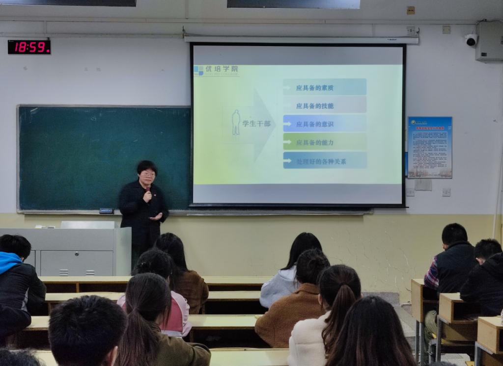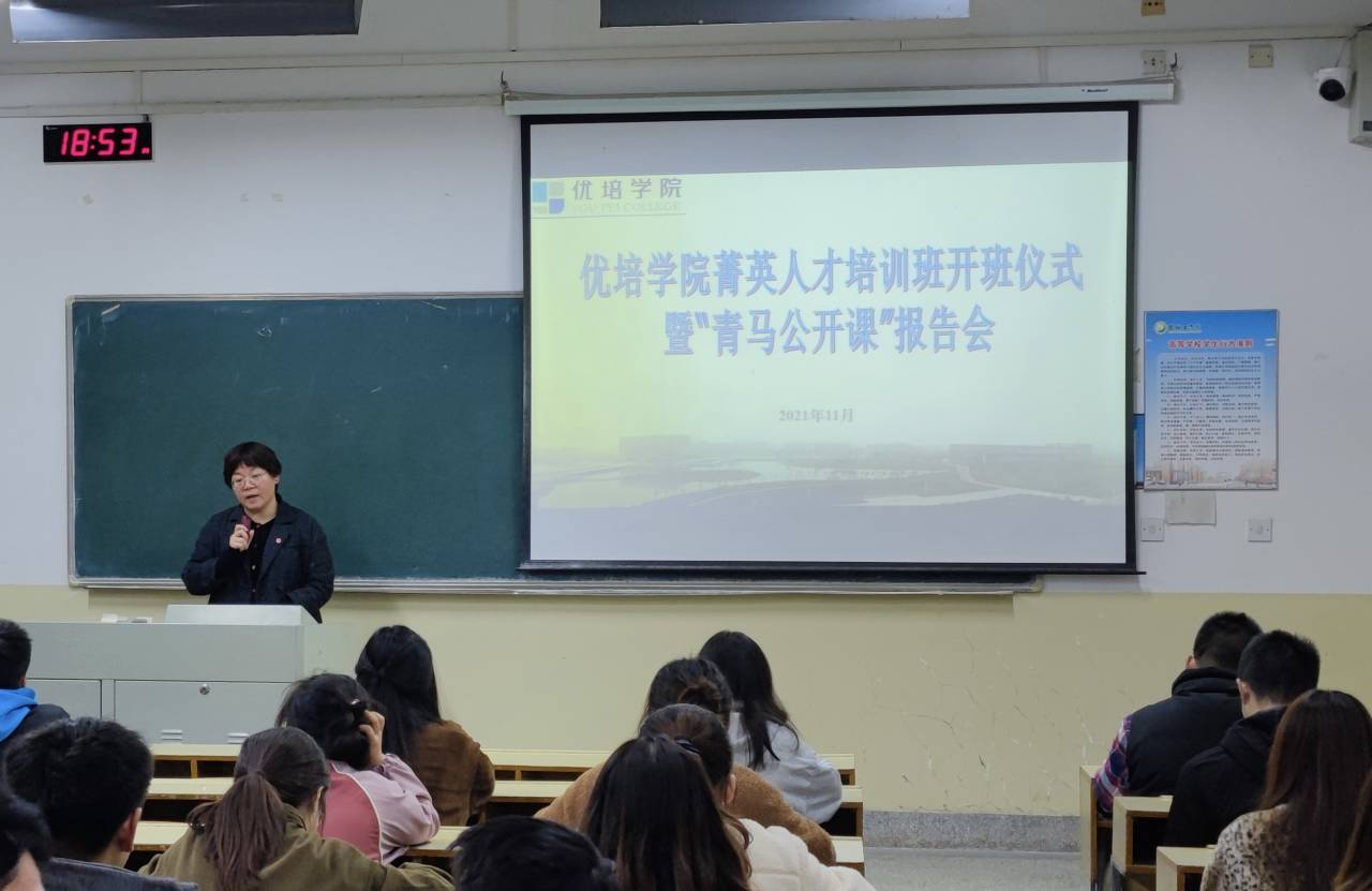 11月14日晚,在建军东路校区知行楼109,英国365公司举行菁英人才培训班开班仪式暨“青马公开课”专题报告会。英国365公司学工办主任、团委书记李凤芹主持并做“内强素质,外塑形象”主题报告,学院全体党员、学生干部和团员代表参加。